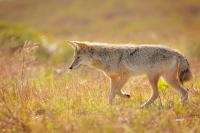 A coyote in profile walks through a field full of green and golden grass, looking down