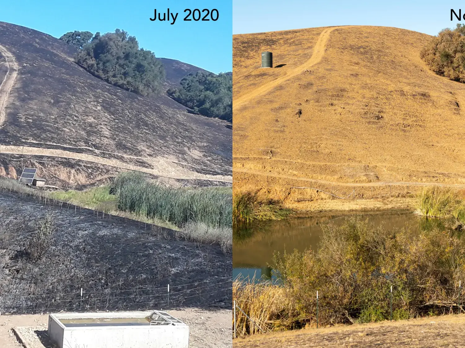 While wildfires like the ones we experienced this summer are often devastating, they also bring with them many benefits to nature. As hot as the fire burned in some parts of the Diablo Foothills preserve, it was less severe in others. This variation is actually a good thing, as it creates a “mosaic of habitat,” as Kat Hill, Educational Aide for the Authority puts it. Fires lead the way for new species that are suited for the conditions left by the fires to take root and provide an opportunity to increase the biodiversity of the land it burns through. So, while some hillsides remain bare and some oak trees are even hollowed out from the fires, there is now even more room for growth. Some species have started coming back, like soap plant, coyote brush, California sage brush, and milkweed. The oak trees are slowly recovering and this will continue, and native grasses are starting to come back. Additionally, many of the plants that were a part of the Caltrans restoration work conducted in 2017 survived the Crews Fire and still thrive today.