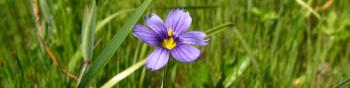 Blue-eyed grass grows throughout California. Its small, 1-inch flowers have six blueish-purple petals and a yellow center. As the name suggests, blue-eyed grass has thin, grass-like leaves, but is technically not a grass species (it’s a member of the iris family). It grows well in moisture and can be found in open, grassy areas as well as woodlands.