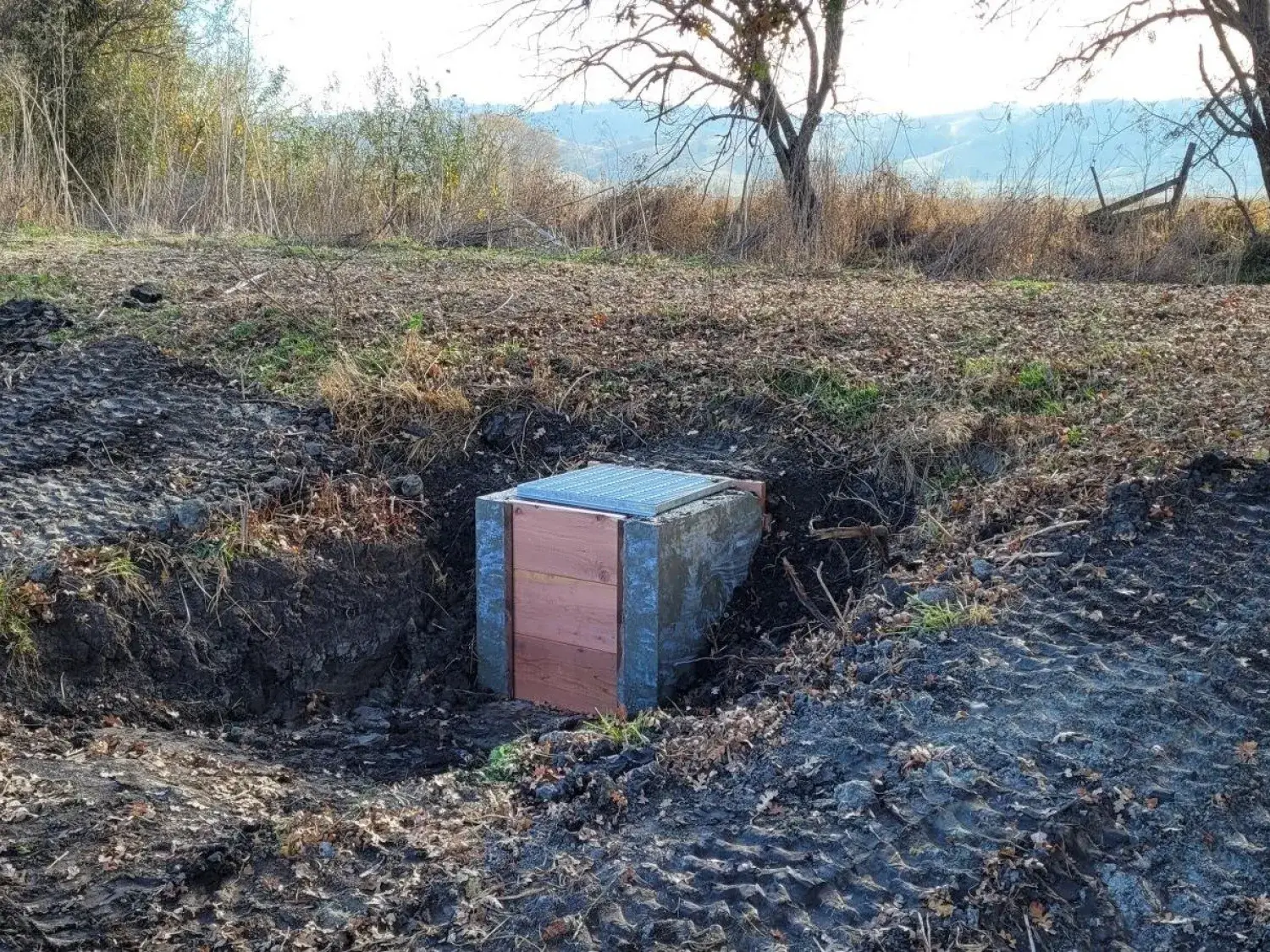 At some point in the past, a culvert with a diameter of 18 inches was installed to allow water from the wetland to flow beneath an earthen levee into Fisher Creek. The culvert controlled the elevation and flow rate at which the wetland drained to the creek.
